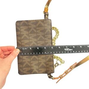 Keywords: Michael Kors, belt bag, fanny pack, synthetic leather, deep brown, MK logo, gold chain, adjustable strap, women's fashion, medium size, pre-owned.