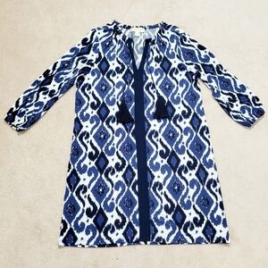 Michael Kors women's dress in a size small, (fits like Medium) featuring a geometric pattern in blue and white. With 3/4 sleeves and a pullover closure, this knee-length dress is perfect for casual occasions. Made with lightweight and stretchy material, it offers comfort and ease of movement, while the oversized design adds a touch of sophistication to the classic sheath style. Ideal for everyday wear or special events, this multicolor dress from Michael Kors is a versatile addition to any woman's wardrobe.