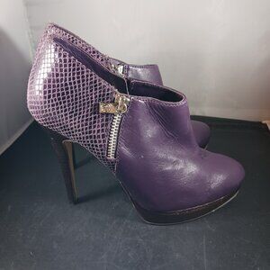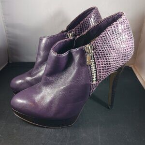 Has sign of wear in the soles, light wear insoles, small scratches in shoes shown in 3rd picture, no box. Please scroll picture for more details. Michael Kors Women's Platform Purple Leather High Heels Ankle Boot size 7.5M. Pet and smoke free home.