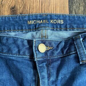 The product is a pair of Michael Kors women's jeans in size 10, featuring a trendy cropped flare style with a frayed hem. The denim fabric is in a classic blue color, making it a versatile and stylish addition to any woman's wardrobe. Perfect for a casual yet fashionable look, these jeans are designed to make a statement with their on-trend features and high-quality construction from a reputable brand like Michael Kors.
