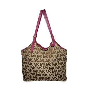 SEO Keywords: Michael Kors tote bag, Michael Kors logo bag, women's large tote, brown pink tote, Michael Kors handbag, luxury tote, MK tote, Michael Kors purse, Michael Kors bag style number not specified.