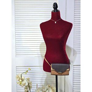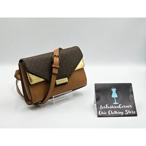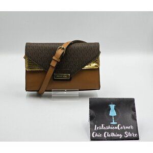 This stylish crossbody purse from Michael Kors is a versatile accessory, blending elegance and practicality. The rich brown faux leather is beautifully complemented by gold accents, making it a sophisticated choice for any outing. Its compact size provides ample space for essentials, while the adjustable strap ensures comfortable wear throughout the day.