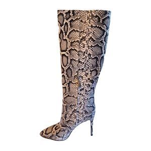 Show off your wild side in the knee-high Rue boot. Crafted from snake-embossed leather, theyre finished with a sleek almond-shape pointed toe and stiletto heels. We love this eye-catching boot with just about anythingpair it with a printed dress for a touch of boho style, or black denim for a sleek, wear-anywhere look.