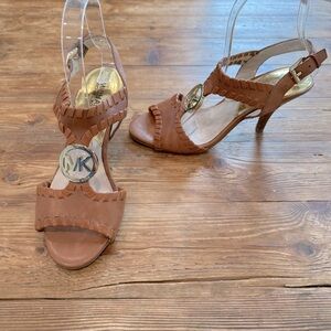Michael Kors Women’s Leather Weave Open Toe Sandal 3” Kitten Heel Camel 7M EUC