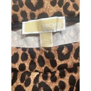 The Michael Kors Women's Leopard Polyester Stretch Ankle Pants in size P/L are stylish and versatile pants perfect for various occasions such as travel, parties, or business meetings. Featuring a high-rise waist with a comfortable elastic waistband, these ankle pants have a slim fit with a skinny leg style. Made from polyester with added stretch, they are easy to care for and ideal for the winter and fall seasons. The leopard print adds a trendy touch, and the Michael Kors logo accents give a chic finish to this fashionable pant.