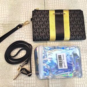 This is a Michael Kors Women's Logo Stripe Continental Set Travel Double Top Zip Leather wallet. It is made of leather and canvas, with a black/gold color and features a strap, zipper, and logo accents. The wallet is about 8 inches long and 4 inches wide, with credit card, checkbook, and folding features. It has a wristlet style and a money, designer, and logo theme.
