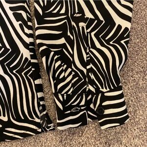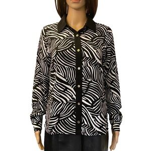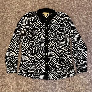 This Michael Kors button-up blouse blends classic style with modern polish. Featuring a black and white print, collared neckline, and long sleeves, it’s perfect for professional settings or elevated everyday wear.
