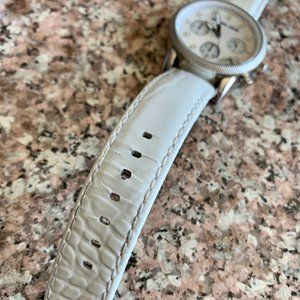 The White Leather Chronograph Watch by Michael Kors is a sporty, fun timepiece that complements your tan with style and functionality. Three chronograph subdials track minutes, seconds, and hours on a 24-hour scale. Luminous hands take the guesswork out of reading in low-light situations, while water-resistance to 165 feet (50 meters) and quartz movement mean it can handle wear and tear. Style wise, this Michael Kors stands apart. Its croc-style white leather band has a buckle that holds the polished case securely to your wrist. Inside, a mother-of-pearl dial radiates more eye-catching whiteness while a textured bezel adds additional style.