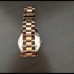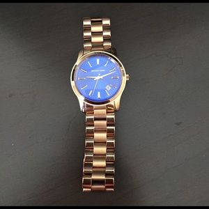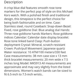A crisp blue dial features smooth rose tone markers for the perfect pop of style on this Michael Kors watch. With a polished finish and traditional design, this timepiece is the perfect choice for being both fashionable and on time. Worn a handful of times.
