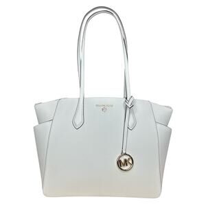 Elevate your everyday style with the Marilyn carryall, the ultimate tote for the modern woman. Crafted from structured Saffiano leather, it showcases the signature gold-tone “MK” hardware and a polished logo charm. The spacious, zip-top interior offers organized storage with a back zip pocket and two slip pockets for essentials. Two side slip pockets add extra utility, while the slender straps sit comfortably over the shoulder. Finished with protective metal feet and gold-tone accents, this refined white tote embodies timeless sophistication.