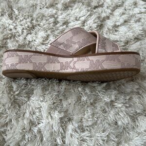 Step out in style with these chic Michael Kors slide sandals. Featuring a soft pink hue, these sandals offer both comfort and elegance for any occasion. MK logo
