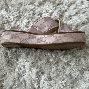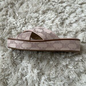 Step out in style with these chic Michael Kors slide sandals. Featuring a soft pink hue, these sandals offer both comfort and elegance for any occasion. MK logo