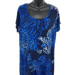 This dress features a bold blue coral print on a navy backdrop, offering a stylish and comfortable option for casual or semi-formal occasions.