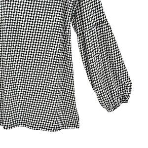 This Michael Michael Kors top combines a classic houndstooth pattern with modern grommet accents around the V-neck. Designed for comfort and style, it offers a sophisticated touch to any wardrobe. Ideal for professional settings, its long sleeves ensure year-round wearability.