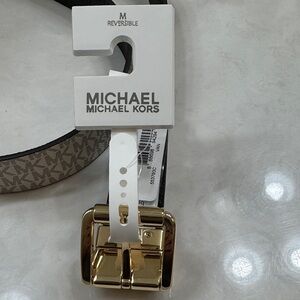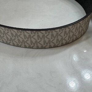 Stylish Michael Kors reversible belt with beige monogram design. Features gold buckle. Ideal for any outfit.