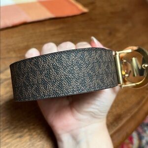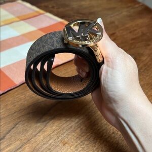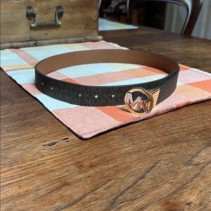 Elegant belt with MK logo buckle. Black and tan coloring that reverses to camel color. 38”L and made for 25-29” waist. There are two more holes made for it to be even smaller.
