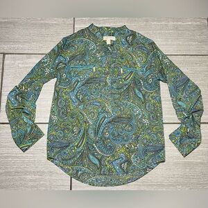Michael Kors Women's Roll Tab Sleeve Blouse Size XS Paisley Print Green Blue