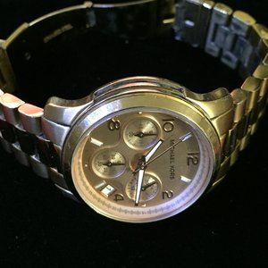 Michael Kors Women's Runway Rose Gold-Tone Watch MK-5128. Stainless steel case: 38 mm. Rose dial. Mineral crystal and rose gold tone luminescent hands and markers. Hour markers: alternating index and Arabic numerals. Date window in between the 4 and 5 o'clock positions. Chronograph with 3 subdials. Case thickness of 13 mm. Push / pull crown. 20 mm rose gold tone stainless steel bracelet with a fold over clasp. Quartz movement. Water resistant up to 100 meters. Fits size 6 1/2". No extra links.
