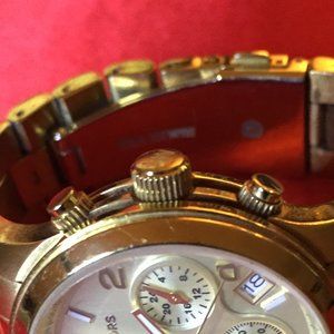 Michael Kors MK-5055. There are marks on the glass. Has white mother-of-pearl dial with golden markers. Gold-Tone Stainless Steel Band. Gold- tone Dial Color.