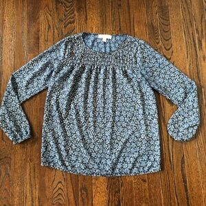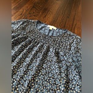 Details: Beautiful MICHAEL Michael Kors Smocked Blouse with elastic cuffs. Semi-Sheer. Gorgeous gold leaves throughout.