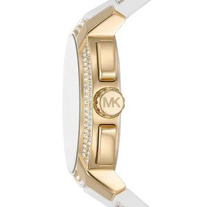 From Michael Kors, the Women's Sidney Multifunction Vanilla Signature Logo PVC Strap Watch features: Gender: Women. White PVC band. White dial. Pav topring.