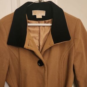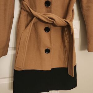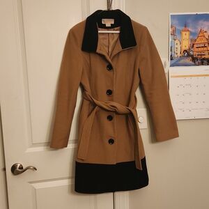 Michael Kors Women's Tan Brown & Black Wool-Blend Pea Coat w/ Sash Size M