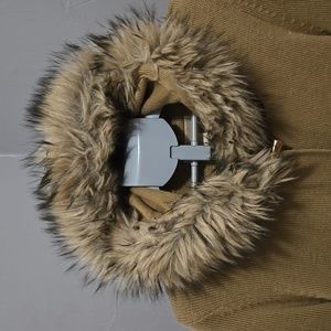 Stay cozy and stylish with this tan sweater featuring a luxurious faux fur hood. Perfect for chilly days.