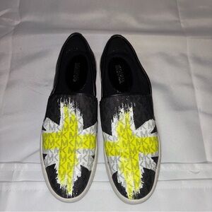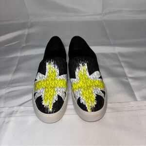 Step out in style with these Michael Kors slip-on shoes. Featuring a striking black and yellow design, these shoes offer both comfort and fashion. Perfect for any casual outing.