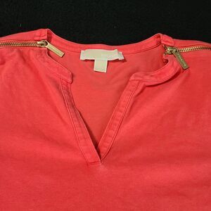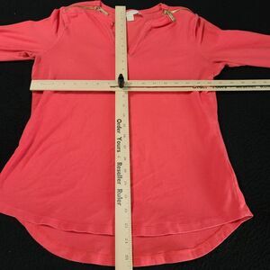 Michael Kors Women's Coral Top in size small, crafted from a soft cotton blend with stretch. This pullover features a zip on the shoulder, long sleeves, and a solid pattern, offering a basic yet stylish look.