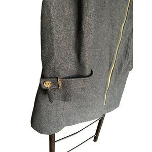 This tailored charcoal gray pea coat provides a polished look with its asymmetrical gold-tone zipper details and structured design. Suitable for professional settings. Belt not included.