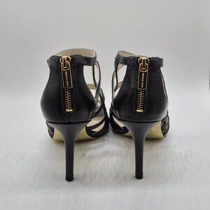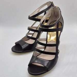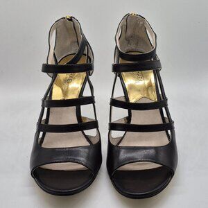 In box. Like new. Worn one time. Michael Kors women's black leather zip back heels. Size 9.5