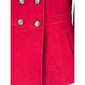 This double-breasted peacoat by Minkpink provides warmth and style. Its wool blend is crafted to endure the cold, while the striking red color adds a vibrant touch. Ideal for professional settings, this coat offers both practicality and elegance. The classic button design ensures a timeless look for the modern woman. Small black dot middle of back (see photo).