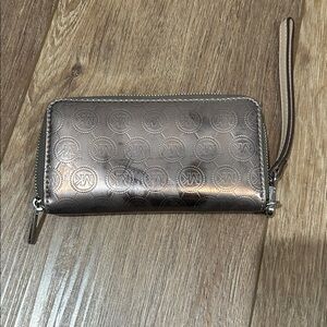Stylish Michael Kors wristlet with a metallic b finish. Features a secure zip closure and elegant logo detailing. Ideal for carrying essentials with flair.