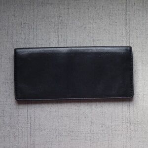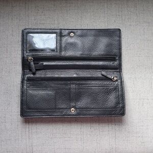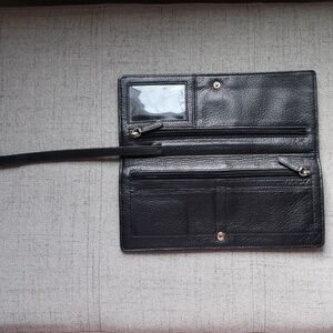 This is a practical black leather wallet with slide-in wristlet strap from the popular designer Michael Kors.