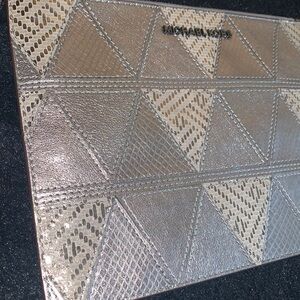 Michael Kors XL Wristlet Clutch Silver Metallic Patchwork w card slots top EUC