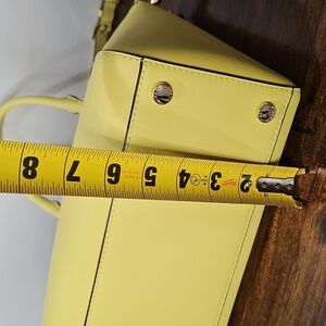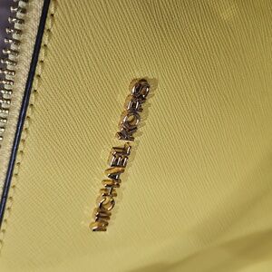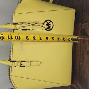 This vibrant yellow satchel from Michael Kors combines elegance with functionality, featuring a structured design and silver-tone hardware. Its smooth leather finish and detachable shoulder strap make it a versatile choice for everyday use. The bag's firm material ensures it maintains its shape, while the zip-top closure and metal feet add practicality and protection.