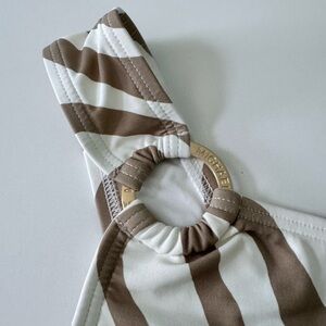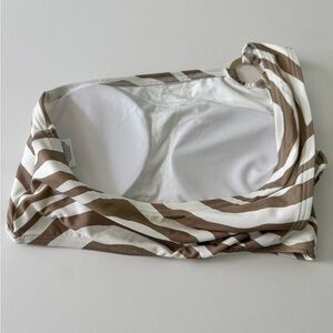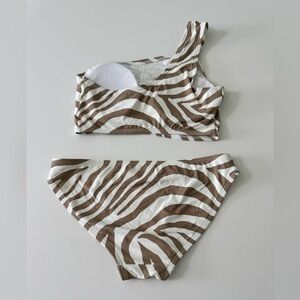 Beautiful zebra print bikini by Michael Kors. Perfect for a sexy beach look. Top is a bandeau style with one shoulder strap with a gold logo detail. Extra strap included that can be attached to the other shoulder.