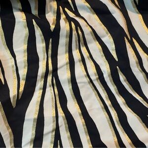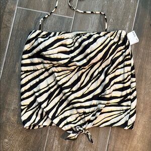 Stylish zebra print bikini top. Features black, white, and gold stripes. Adjustable straps for comfort.
