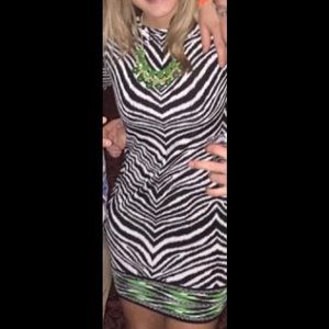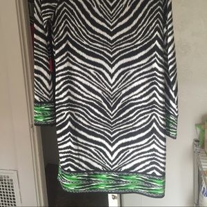 Zebra print with green design across bottom of the dress and sleeves. Even though it is long sleeve, it is light enough to be worn for a summer event!