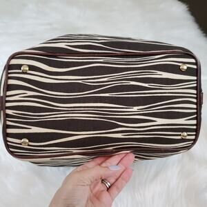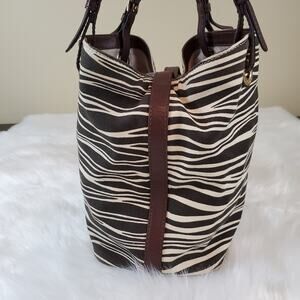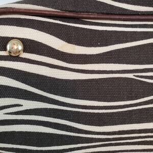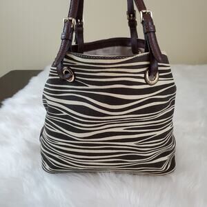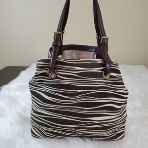 Michael Kors Zebra Stripe Tote Shoulder Bag. Zebra Print Canvas bag with Brown leather trim and gold-tone hardware. Open top, Side snaps to give the bag more structure. This bag measures approx. 12"L x 10.5"H x 6.5"W. Double leather straps with approx. 9.5" Drop. This bag is preowned in good condition. Couple spots on exterior shown in pictures. Interior could use cleaning. See pictures for details.