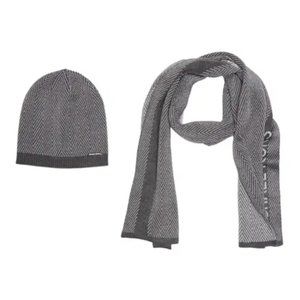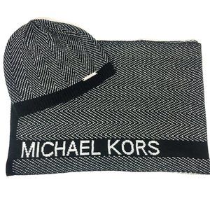Michael Kors Scarf & Beanie Hat Set featuring a clean design, solid edges, metallic zig-zag pattern, and vertical Michael Kors logo.