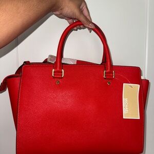 Brand new with tags, Michael Kors bag. Can be held or also comes with body strap with zipper for extra security. Bright orange and perfect for the spring/summer season. Great bag for work, spacious