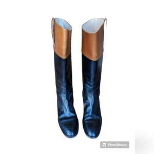 The riding boot’s traditional riding silhouette is infused with luxurious detail. It is crafted in Italy from supple calf leather that lends luxe character. Featuring a flat heel, it’s designed to be slipped on for maximum ease of wear from the city to the country. 16.5" tall. Minor scuffs as shown in photos.