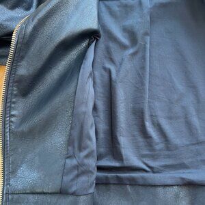 Fun moto style jacket featuring off center zipper in gold with gold details. Good used condition, no flaws noted. Measurements in pictures