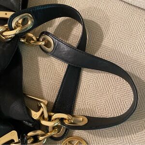 Michael Kors black leather large chain shoulder tote handbag with gold accents with front mk accent