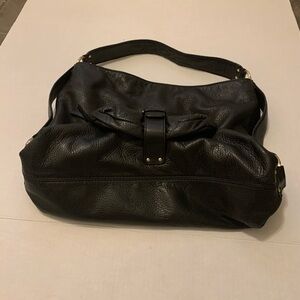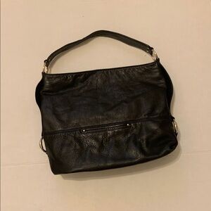 Black leather hobo style preowned purse by Michael Kors. Has one outside pocket on one side plus an outside pocket on the other inside has four small pockets plus one large zipper pocket. Hobo style does fit over the shoulder measures approximately 15 x 12 x 3. handle drop is approximately 10 inches normal wear