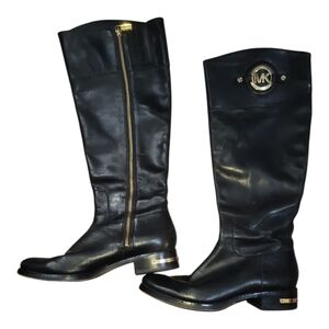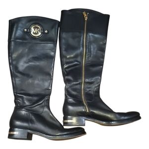 Elegant black leather boots featuring gold MK logo the stockard boot offers an updated take on the classic riding style. The polished leather and gold-tone hardware ensure that this pair will leave a lasting impression season after season. Approx heel. 1.25". Wear them to elevate your tailored separates by day then slip them on with a little black dress for an elevated evening look. Check out my closet and bundle to save 💵bundles over 5 lbs will require purchase of extra postage. Offers always welcome 😊Non-smoking cat friendly home 😻Bookmark my closet as new items added weekly 💕thank you for shopping my closet.