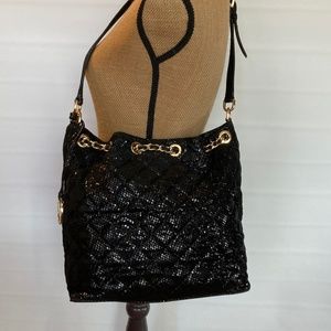 This is a Michael Kors handbag, purse. The exterior is a quilted snake skin, with adjustable shoulder strap. It has 5 interior pockets, one is zippered. It is about 11" long and tall and 5" wide. Roomy interior with snap closure.