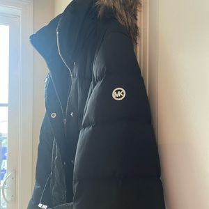 Great condition MK black winter coat with silver hardware and detachable faux fur hood! Some wear and tear on the belt buckle as shown. The belt is perfect for cinching the waist line and creating a flattering look! Cuffs at the sleeves as shown. MK logo on left sleeve. I am a size small and it fits perfect!