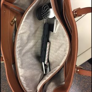 Leather material, very clean on the outside and inside! Only used a few times! Very good shape!have the original bag it came in.